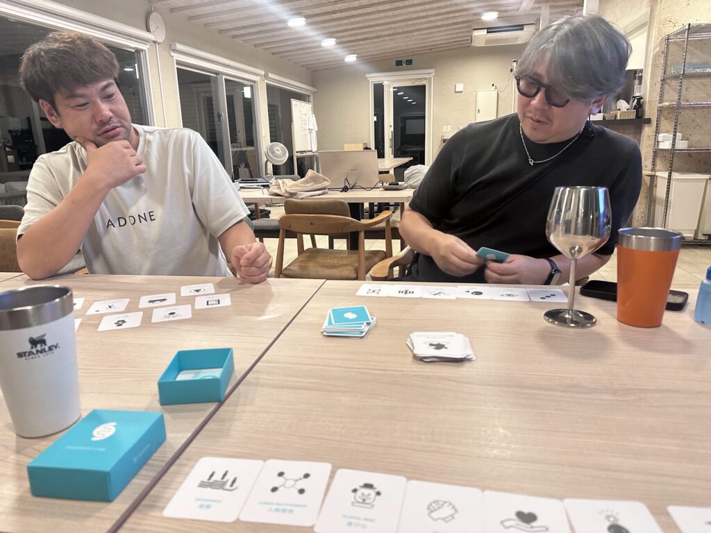 その後は、サウナ、露天風呂、美味しいご飯を食べて、晩酌をしながら価値観カードをやりました。